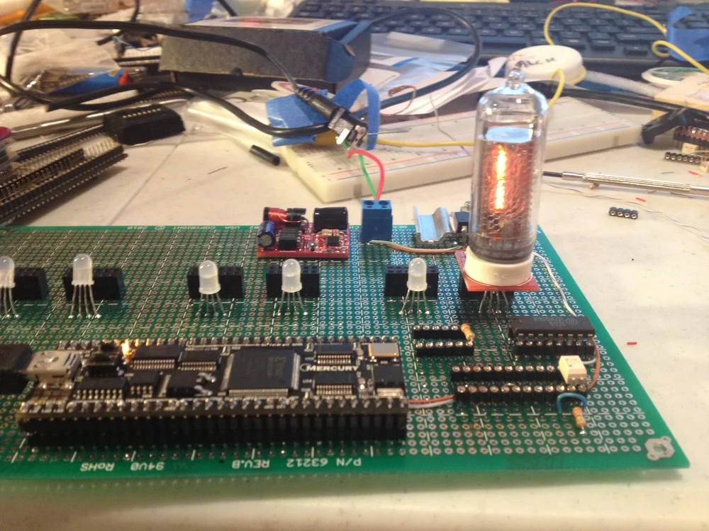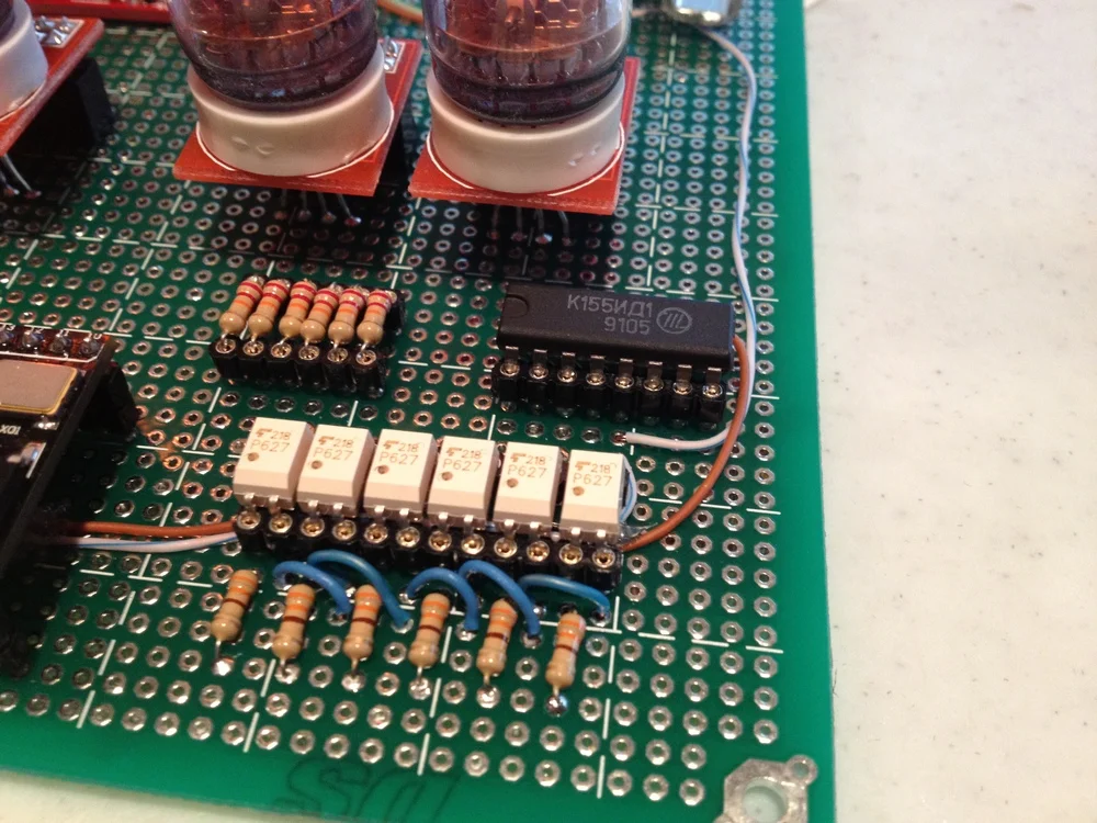 The Mercury board is connected to the Soviet-equivalent of the 74141 driver IC (K155NA1), which converts BCD into one-hot digit cathode driver signals. It is also connected to a bank of TLP627 optoisolators, which control the anodes for each Nixie tube. A ring counter loops through and multiplexes the tubes such that all tubes are displayed within 16.67ms (1/60Hz). About 10% "dead time" was added in-between the display of each tube to mitigate a ghosting problem that occurred, where the previous digit would be displayed on the next tube! (I think this was a result of the slow switching speed of the Soviet K155NA1.