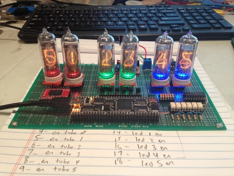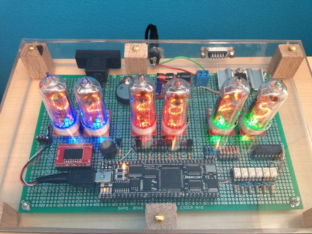 Close-up view showing the RTC, buzzer, Mercury FPGA module, LED driver transistors, and LED & tube series resistors.
